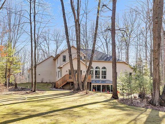 Gorgeous custom built 1.5 story home features over 1.53 wooded acres. Remarkable curb appeal greets you upon entry, along with an arched, brick entrance! Spacious living room with built in cabinets, fireplace and soaring ceilings. A roomy kitchen/dinette offers a large granite island/snack bar, abundance of maple cabinets, stainless steel appliances, patio doors to deck and more. Private first floor office with built-in maple cabinets. Sprawling 1st floor master bedroom suite with tray ceilings and tons of windows overlooking the beautiful backyard. Large master bath with double vanity, maple cabinets, spacious walk-in tile shower and enormous walk-in closet. 1st floor laundry room with sink, hanging rods, drop zone and more! Other features include 2 large bedrooms on the upper level with fans, great sized closets and bathroom that has double vanity and separation into the shower area. The huge walk out lower level is the ultimate getaway with a family room and built-in maple cabinets, tons of windows for amazing natural lighting, large bedroom, full bathroom, and built in, large bar and rec room for entertaining. One of your favorite rooms will be the 4-season sun porch that boasts a fan, tons of natural light through the almost all glass room, knotty pine wall, heated floors and overlooks the private and extensively landscaped yard. Retaining walls, stone patio, 3+ stall garage with steps to the basement. The list goes on and on! You are going to love this home!