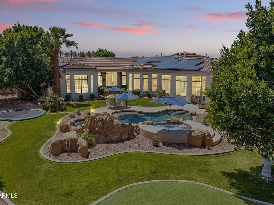 RARE FIND! Welcome to ARBOLEDA, one of the most prestigious gated communities in Mesa, AZ. This semi-custom home sits on over a 3/4 + acre lot & features a FINISHED BASEMENT THEATER w/WET BAR. The Gourmet Kitchen was just remodeled & features Custom 2.5'' Eased Edge QUARTZ Countertops, Dual Ovens, Gas Range, Walk-In Pantry, & NEW modern Top & Bottom Cabinet LED Lighting. Property Updates Include: Interior Paint, Fireplace Mantel & Tile, Luxury Carpet, Water Heater, Water Softener, Fans, Fixtures, Blown-In Attic Insulation & MORE. Step into your private backyard OASIS! This Resort-Style backyard features a gorgeous POOL & SPA w/Rock Waterfall & Custom ROCK WATER SLIDE, Built-In BBQ, & Below-Ground Trampoline! Multiple mature citrus trees are on the property, including Orange & Lemon Trees!