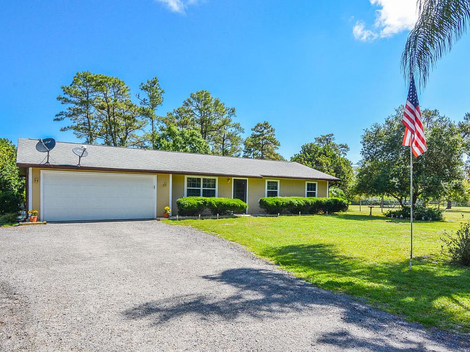 Perfect home for the Horse and Hobby farm lover! This property boast 3 wonderful acres. 2 acres are zoned AU and 1 acre is zoned GU & perfect for trail riding with your horses. Your animals will love the pristinely kept 3 stall barn and tack room, round pen and their outdoor time in the shaded pasture. The property is fully fenced and gated. Several gates have been installed for evacuation purposes, seeing as the home is on a dead end. The home is immaculate and well loved. The siding is all new Hardie board, the garage door is hurricane rated, the a/c system is brand new and runs cold!There is a very nice chicken coop on property as well as a couple outbuildings to include a large workshop and a couple sheds. There are several fruit bearing trees on the land as well as grapes! Must See!