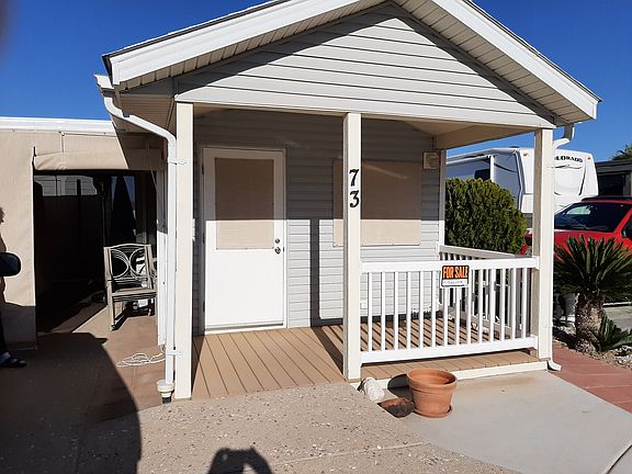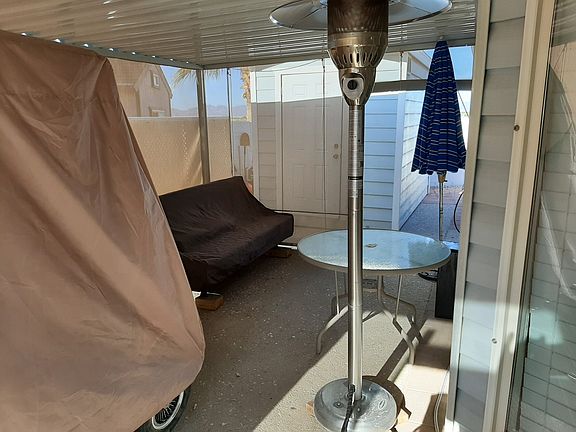 PARK MODEL TRAILER Ready for occupancy - all furniture & appliances included. Seasonal park- open for owners Sept. 1 through May 31. This season the occupancy schedule has been changed to Oct. 1 through April 30th. This lovely, well-maintained home has great curb appeal and a cozy patio facing the street & clubhouse; it is within a gated 55 plus RV park with swimming pool, hot tub, pool tables, horseshoes, ping pong, and all the usual social events. It has drywall throughout, carpet & vinyl floors, a dishwasher, a convection/ microwave oven, a residential size refrigerator, a chandelier over the dining table, ceiling fans in living room & bedroom, TV & DVD player, vaulted ceilings, extra insulation in floor/ceiling&walls, roof is elastomeric coated for better heat reflection, cable TV included, UV window coverings, exposed aggregate driveway, paver patio, and a large outside storage shed including many tools, & miscellaneous supplies. The storage shed has plumbing access for washer and conduit present for washer and dryer. New 240 SF aluminum patio enclosure with sun/ privacy shades with new ss natural gas patio heater and convertible bed/sofa. It would be a lovely home furnished in any style. The master bedroom has a queen size bed and a full room width reach-in closet with mirrored doors; the bath has a tub with shower. The living room has a Buck Stove gas fireplace. WHAT I LOVE ABOUT THE HOME A great asset about this RV park is that you own your own lot so no monthly lot rent! This resort is surrounded on three sides by the Blythe Golf course which is a hidden jewel in the desert, well-maintained, player-friendly and modest rates. Property includes Yamaha gas golf cart with new cover. There are spectacular views of the clear desert sky and the mountains all around. The Colorado river is nearby for those who love water sports: fishing, cruising, water skiing, paddling. The community college is about one mile away and it is about five miles through lovely farm country to the town of Blythe. This home is a perfect winter retreat. It is quiet, private, beautiful and convenient. Home is close to walking gate for quick entry and exit for those people with dogs. The nearest international airport is Palm Desert there is an airport in Blythe that accommodates jets. Clubhouse with swimming pool, hot tub, pool tables, ping pong, horseshoes, cards, movies, many social events. The area is lovely for walking, biking and exploring the desert. FACTS Mobile / Manufactured Built in Dec.2005 HOA Fee: $109/mo includes cable TV, internet, water, sewer, trash removal and recycling bins.