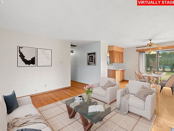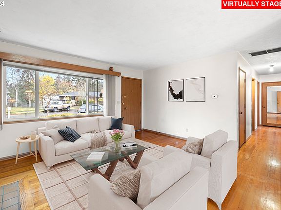 Welcome home to this delightful 3-bedroom, 1-bath, 1,055 sq. ft. ranch-style home that combines comfort, charm, and convenience. Nestled on a serene street, this property offers a host of thoughtful touches throughout. Step inside to find gleaming hardwood floors in the living, dining and bedrooms. The comfortable living room captures beautiful natural lighting with the large picture window. A wood-burning fireplace with a mantel is perfect for the upcoming holidays in your new home. The kitchen is a functional and cheerful space, complemented by a breakfast/dining area with a view of your spacious backyard. Enjoy peace of mind with upgraded windows, a newer roof, and central air conditioning, ensuring year-round comfort and efficiency. The outdoor space is just as appealing! A large covered front porch welcomes you, while the fenced backyard is a haven for relaxation, featuring a grassy yard, patio, and plenty of space for gardening or play. Additional highlights include a two-car attached garage with bonus storage/ workshop area, a washer and dryer, and an extra-wide driveway providing ample parking. This charming home is designed for easy, one-level living and is conveniently located and affordably priced! Don’t miss the opportunity to make this lovingly maintained property your own! [Home Energy Score = 3. HES Report at https://rpt.greenbuildingregistry.com/hes/OR10234349]