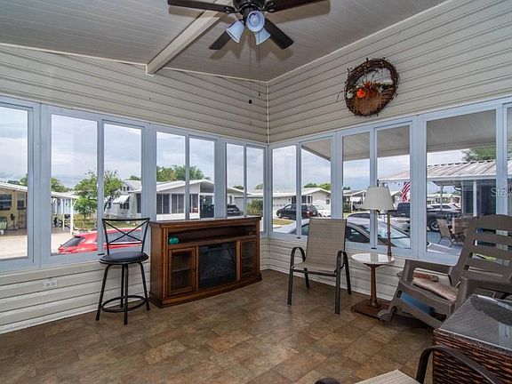 BEAUTIFUL PALM HARBOR: 2 bedroom, 2 bath with gorgeous front glassed in Florida room and 6x23 shop/storage room. There is room enough to park at least 3 cars here maybe more! Light bright roomy kitchen with tiled backsplash, dinette off one end and separate dining area with built in china buffet for larger gatherings. Spacious living room with bookshelf and this home is being sold FURNISHED! Oversized master bed and bath boast walk in closet and shower. This home has 1400+ SQFLA. So pretty! The updates include HVAC 2018, interior paint 2019, windows on the Florida room 2020, plumbing 2021 and it has a metal roof over! GATED community and NO lot rent. $165.00/month covers grass cutting, water, sewer, trash, guard at the gate, pools, clubhouses and so much more! This community is located close to home store, grocery, pharmacy, gym and eateries. Not far from Wiregrass Town Center!