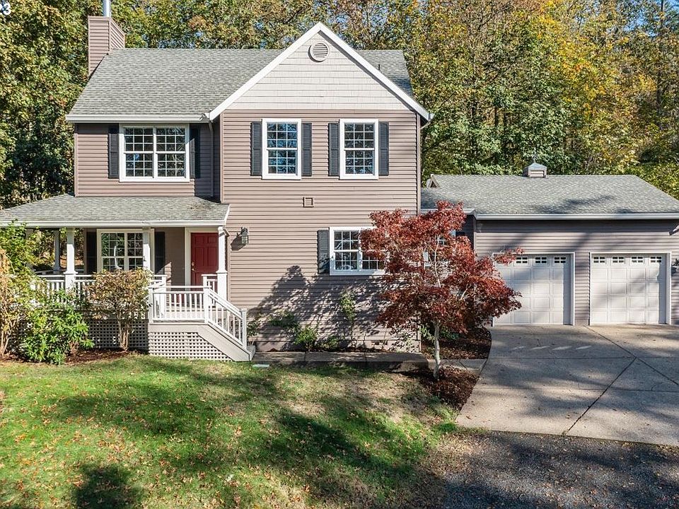 Beautiful 8.64 acre property perched on a hillside above the Willamette River. Paved private drive w/gated entrance to ensure privacy. You'll fall in love with this home from the charming wraparound porch to the cheerful interior featuring oak hardwood floors, high ceilings & a brick hearth wood-burning fireplace. The spacious kitchen boasts newer stainless steel appliances including glass top range, built-in microwave & dishwasher. Freshly painted interior & new carpet on stairs & upper level.