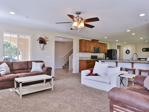 Step in and enjoy your new beautiful single family two story home. Your new home is in the coveted Canyon Hills community! As you first enter, you find the high ceiling foyer with plenty of natural light streaming in the windows and recessed lighting through out. Then, make your way into the kitchen that has been upgraded, newer Samsung Suite black stainless steel appliances, granite, recessed lighting, grand island, and two pantry closets. Just off the kitchen area is a family room and dining area with over sized windows and slider to the backyard. There are four spacious bedrooms, one DOWNSTAIRS for an office or guest. The bathrooms are conveniently located throughout, one downstairs and two upstairs and a laundry room. Make your way up the staircase of the home, which features the master suite with walk in closet and bathroom. The OVERSIZED backyard features amazing mountain views and plenty of room to play or rest! The three car attached garage also has direct access to the house and is ready for the Tesla to be charged. Some additional bonuses are the energy efficiency of the home with solar. The community club house with a low HOA payment of $118.50 a month has three sparkling pools, spa, play zone for the kids, park, BBQ area. LOCATION, LOCATION, LOCATION! You can find all the sought after locale - Shopping, Entertainment, Restaurants, and Grocery, to make for a seamless place to do life! So make us an offer we can't refuse!
