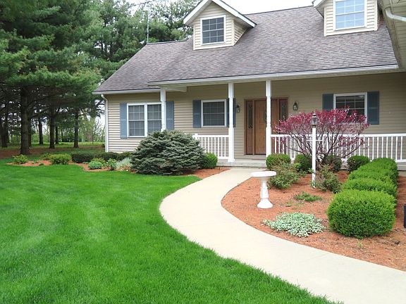 Beautiful, custom, one owner home! Very open and spacious living room/dining area and kitchen with vaulted ceilings. Kitchen has breakfast bar, corner display cabinets and appliance garage. Living room opens to the heated sun room with french doors. Split design with master suite separate from the other bedrooms. Master has walk in closet and on suite jetted tub, separate shower, and double sink vanity. Carpeted bonus room over the garage, could be 4th bedroom/office/storage. Multi-use carpeted workroom, 18x13 with double doors to the garage. Full basement, partially finished- good storage. Main floor laundry/mud room with sink and ironing board. Garage has sink, double doors to the outside. Maintenance free deck. Storage shed. Beautiful, neatly landscaped lot with gorgeous views of the countryside.