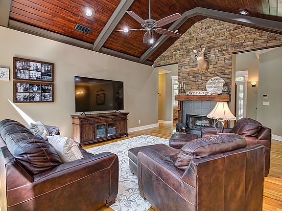 Spectacular waterfront home with loaded dock! A timeless design open concept ranch over a full finished terrace level. Patio doors open onto double porches from every room overlooking Lake Lanier. Great room with rock fireplace, cathedral wood and beam ceilings, and wall of windows. Open concept floor plan with bay window dining area, state of the art gourmet kitchen with Sub zero fridge, wine cooler, 6 burner Dacor gas range, food warmer drawers, single bowl sink overlooking porch. Beautiful timeless cabinets. Built-in bench seating,all hardwood floors on main level.Master on Main with full sitting room, elegant master bath with jacuzzi and separate tile shower. Additional guest bedroom and hall bath on main floor. open terrace level has an additional 2 bedrooms and full bath plus a wonderful bunk room that sleeps 6. Check out the media room with full bar and rock fireplace! State of the art utilities with a Rheem heat pump hybrid water heater. Half bath and laundry in mudroom between kitchen and 3 car garage. 3rd garage is deep with workshop area and access to back porches. This backyard oasis home is waiting for you. Lakeside patio/fire pit, outdoor shower, tree house setting. Tranquil yet filled with sounds of fun from lake lovers. Fantastic deep water cove with wide expanse. Centrally located between Bolling Bridge on Hwy 53 and Duckett Mill Campground. Duckett Mill is a quiet road only 2 miles long. Banks Mountain is a great lake neighborhood filled with gorgeous homes. This one is built to last with all brick and stone, hardiplank with cedar shake accent/rustic beams. Tons of parking for friends and family. Come see this one!
