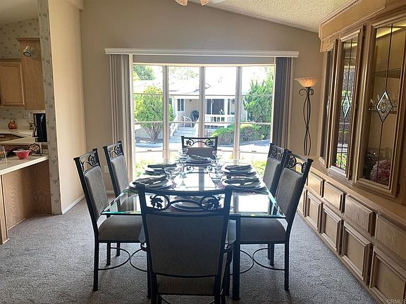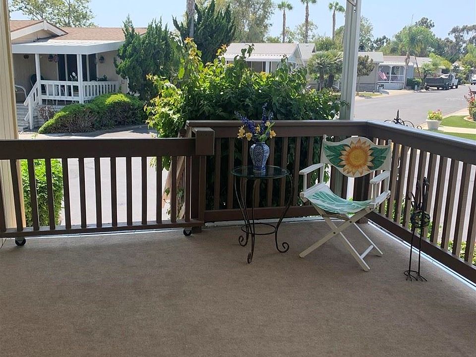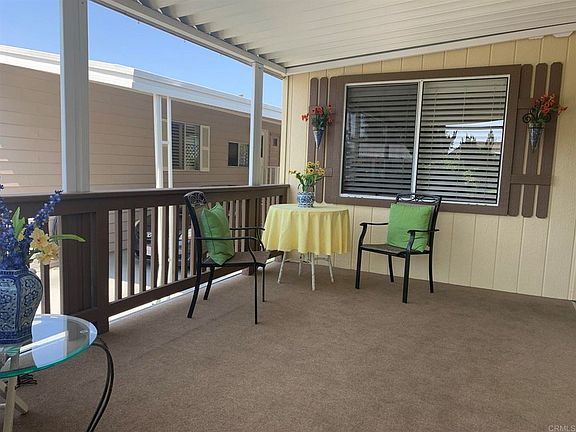 Welcome to Rancho Carlsbad. an active 55+ community with 504 homes. YOU OWN YOUR OWN LAND--no space rental! This two bedroom/two bath home also has a large bonus/office with built in bookcase desk located immediately off the living room. Linger awhile to enjoy the ocean breezes on the inviting front porch which includes an easy guide front gate. Upon entering the front door, a right turn leads you into the dining room featuring a lighted built in buffet and a great view through a huge bay window. The kitchen has black appliances and generous cabinets and counter space. Immediately adjacent to the kitchen is an oversized laundry room with washer/dryer hook ups, desk, a pantry and addition banks of cabinets for storage. From there is the back door with easy access to the enclosed carport and the oversized shed with additional built in storage. Heading back into the house, pass the front door and you are now in the spacious living room with stone, glass log, corner fireplace. Double doors open to the bonus/office. The main bathroom is located next to the second bedroom. The Master Bedroom is large with wall space to accommodate a king size bed as well as several dressers and a generous walk in closet. The Master bathroom has duel vanity with double sinks, a large soaking tub and a separate shower. 3411 Don Alvarez is move in ready with new floor coverings throughout the home, a newer roof and recent exterior paint. This home is located on one of the quiet streets in the community and has one of the larger back yards currently hosting three fruit trees.