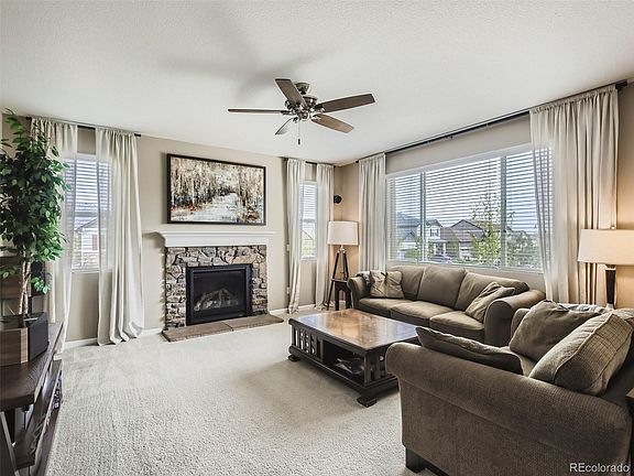 Immaculate 4 bedroom, 3 bathroom home located on a spacious corner lot just feet away from green space. This home features upgrades throughout, including White Springs granite countertops, a finished garage, marble floors in the first floor bath, upgraded light fixtures, and stainless steel appliances complete with gas range. Enjoy time with friends and family in the open concept floor plan with a sunroom and ample natural light. The spacious primary suite includes coffered ceilings, a beautiful bathroom and walk-in closet. Three additional bedrooms on the upper floor make a perfect family sleeping arrangement. This exquisite home is a must see for anyone looking in the Wyndham Hills area, perfectly situated in this family-friendly neighborhood with access to trails, the pool, nearby schools and easy access to I-25. This is a rare gem - don't miss your opportunity to own in this amazing neighborhood!