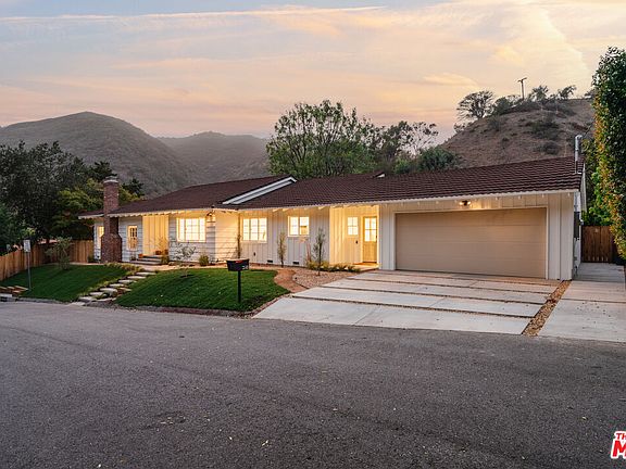 Come home to a timeless mid-century design with peaceful tranquility in this reimagined 1955 ranch nestled in gorgeous Mandeville Canyon. Located on a coveted, quiet, cul-de-sac, this 3BR/3BA home rests on a flat, sunny lot with green mountain views. Upon entry through the front door you are greeted by refinished, original hardwood floors that carry the bright warmth of the California outdoors throughout the home. The spacious step-down living room, complete with a wood and gas-burning brick fireplace, invites you inside with all day sun and natural surroundings via its large windows and adjacent patio. The tastefully renovated floor plan perfectly blends partial open concept with functional practicality including a spacious family dining area and gathering space at its center. The bright kitchen boasts a large Viking stove, oversized sink, organic wood accents, low maintenance quartz countertops, stainless appliances, and a large food pantry. All easily accessible via a side entrance through a dedicated laundry and mudroom, conveniently located by the attached two-car garage. Entering the bedroom wing of the house, past the groovy powder room, the primary bedroom soothes with magnificent views, a massive eighteen linear feet of closet space, and a fully updated ensuite bathroom with floor-to-ceiling tile, heated floors, handmade walnut vanity, and a walk-in wet room complete with a shower and an elegant freestanding tub. Two additional and spacious bedrooms are adjacent, connected by a fully modernized, floor-to-ceiling tiled bathroom. Soak in the natural landscape in the wraparound backyard with dual patios, outdoor dining area, natural gas-plumbed grill, and flat lawn, perfect for entertaining. Moments from world-class hiking and mountain biking trails, this fully revived home -- move-in ready with all new tankless-heated plumbing, all-new electrical, and all-new smart controlled HVAC kept cool by the newly-insulated attic -- boasts all of the best aspects of Mandeville Canyon living.