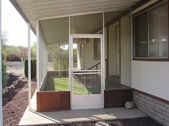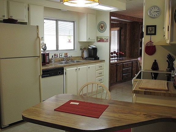 Lovely 2 bedroom home with large living/dining room with lots of natural light. Large freshly painted open kitchen with lots of counter space and laundry room as you enter back door. All major appliances stay. Beautiful screened porch off living room. Large yard. Home comes with 9 x 10 foot shed with electricity at end of three car carport. Awnings both sides and front. Lot rent $560.75 plus Land does not convey.