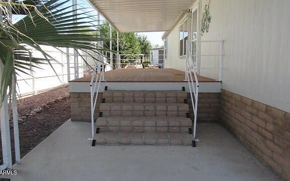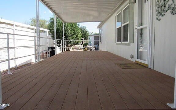 This large, elegant home offers a beautiful split floor plan. The kitchen has center island and plenty of counter and cabinet space. All appliances come with the home. It has a wall oven with built in microwave and electric cooktop stove. . There is an area between the kitchen and the living room for a coffee bar with drop-down lighting. Washer, dryer and upright freezer in the laundry room. The laundry room has cabinets above the washer and dryer. Spacious living room with exterior door leads through a storm door to a beautiful, raised deck with recently painted white railing, The primary bedroom and en-suite bath off the living room which contains two separate walk-in closets, walk-in shower with seat and a built-in make-up area with bottom storage. Double bowl vanity and linen storage cabinet next to the sink. Commode is in a separate area with door for that extra privacy. Down the hallway off the kitchen you will enter a fantastic desk area with cabinets and computer desk station, a perfect area for an office. Across from it is the guest bathroom which has double bowl sinks and a tub. There is plenty of storage cabinets and a linen closet. From there you have two more bedrooms with lighted closets. The two guest bedrooms have carpet. All bedrooms have ceiling fans, as well as living room and dining room. The kitchen and bathrooms have vinyl flooring. The living room, primary bedroom and bath, hallway and computer room, and the dining room have wood flooring. All window coverings stay with the home. Matching large storage room off the carport has electricity.