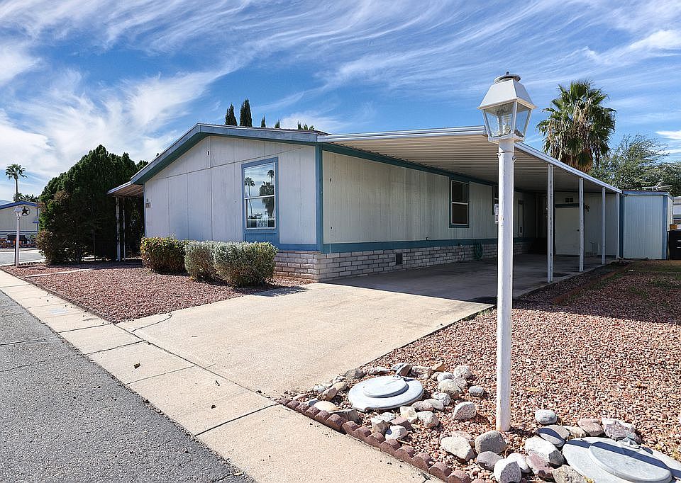 Gracious living in charming home in gated 55+ manufactured home community. The grounds contain two swimming pools, a community garden, library, workout room with brand new equipment, spa, sauna, private dog park and more. Land does not convey with home. Close to shopping, hospitals, entertainment, restaurants, parks, hiking trails, yet in a safe and quiet eastside location. As much social life as you want or just peaceful living. owner highly motivated, so make an offer. Elegant double wide with new shingled roof, vaulted ceilings and split floorplan. Newly renovated interior. New hot water heater. This beautiful 3 bedroom 2 bath home is on large lot on quiet street. . Kitchen opens to dining/living room. Wood floors and laminate floors combine with tile in the bathrooms and kitchen for that contemporary look. Lots of closet space including walk-in in master suite. Ceiling fans and large windows for cool breezes and lots of sunlight. Major appliances stay. Security doors front and back. Large screened porch and open front porch big enough for chairs for those quiet afternoons. 2 storage sheds. Large laundry room with extra shelving and storage space. Land does not convey. Owner highly motivated so make an offer.