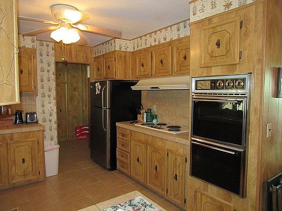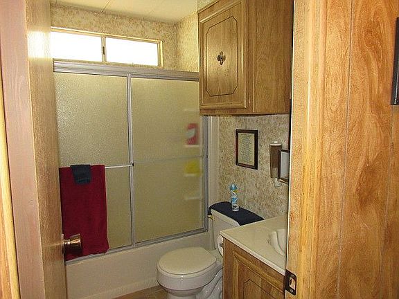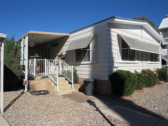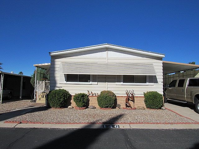 The land does not go with the house. Over 55 park. Lot rent $560.75 The home will be left partially furnished. 1 Year Home Warranty is included. This spacious, beautiful home features a formal living room, with a family room that adjoins the dining area, and features a full length, built in Hutch with Mirror. Glass sliding doors from the family room open to a long, carpeted deck with a small enclosed yard and view of the mountains. 2 of the Bedrooms and Full bath are located on the South end. Large Master Bedroom is at the North end, and has a walk-in closet that adjoins the Master Bathroom, which features a sink/vanity, toilet and walk-in shower, with plenty of room to install a separate bath of your choice. Queen Tempur-pedic bed stays. Dresser stays. Large laundry room with folding area, drawers, and a small cabinet pantry. Living room, family room and 3 Bedrooms have newer carpet (installed in 2016), with ceramic tile throughout the rest. Newer dishwasher, garbage disposal, fridge, washer and dryer. Kitchen has tons of cabinet space, and 2 ovens that are all electric Water Heater is GAS. A/C Heater Combo unit, no evap. Large Carport area, features ramp and stairs, as well as another sitting area with privacy panel and small graveled yard. No grass, all gravel landscaping with a few trees and bushes. Tuff Shed in carport has electricity. 220 power available. Roof was re-coated in February 2019.