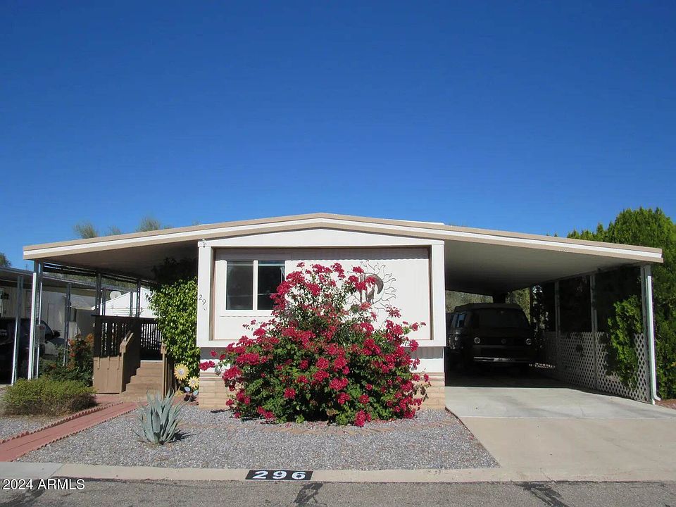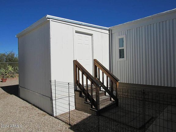 A beautifully maintained 2-bedroom 1 bath home ready for new homeowners to make it their own. Home does come furnished and would make a fabulous winter retreat. All appliances are included along with a washer and dryer. Newer laminate flooring throughout for easy upkeep. Newer water heater and A/C. There are two storage sheds on the property for extra storage needs. An inviting back deck off the primary bedroom with views of the desert and mountains. The sliding glass door off the bedroom offers easy access to the deck. The raised porch comes with drop down sunshades. The carpeted add on storage area is 11x11 and has a window for views back yard. Off the rear steps of the porch is a small, fenced area for a pet. Modern ceilings, fans and light fixtures in each bedroom. Double paned windows throughout.