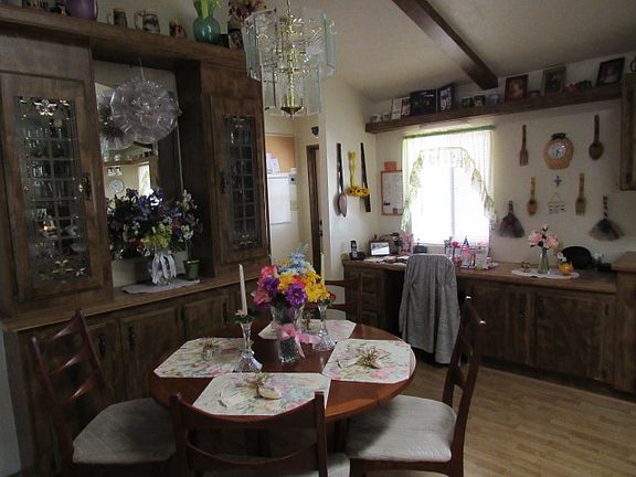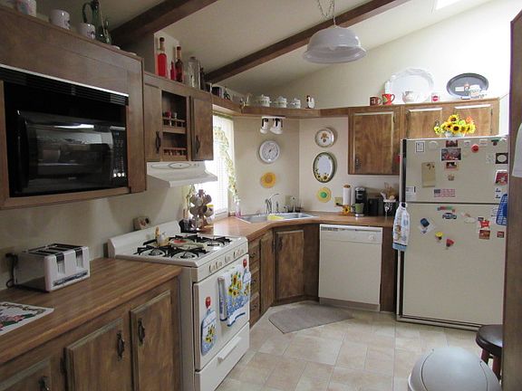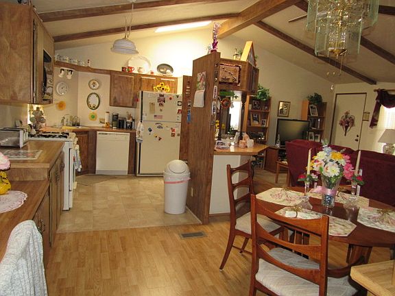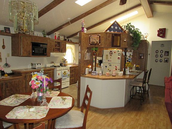 You will enter from the covered porch into a beautiful carpeted living room with cathedral ceilings, the family room just to the left and kitchen/dining directly across, gives you an elegant, spacious living area. Lots of windows and skylights for maximum light. All large appliances stay. Blinds and window treatments stay. Ceiling fans in living room and all bedrooms. Elegant kitchen has lots of cabinet space surrounding stove and breakfast bar extension for extra storage and a desk area. Washer and dryer along with large walk in pantry stay in indoor laundry room off 3-car carport Large utility closet between kitchen and hallway leads to the two bedroom part of house. Each bedroom has built in dresser with two walk-in closets and laminate floors. Between them is large bath with walk-in shower with built in seating. Spacious, carpeted master bedroom has walk in closet and large bath en suite with garden tub and walk-in shower. Well-kept yard has mature grapefruit and orange trees. Private space in back would be perfect for barbecue. 10X10 Shed with electricity in carport. Land does not convey.