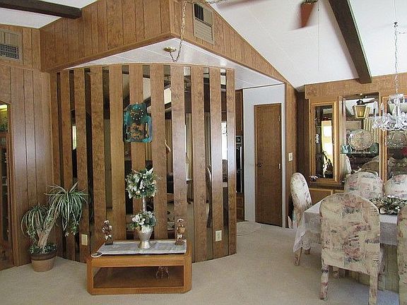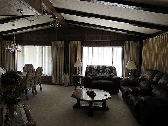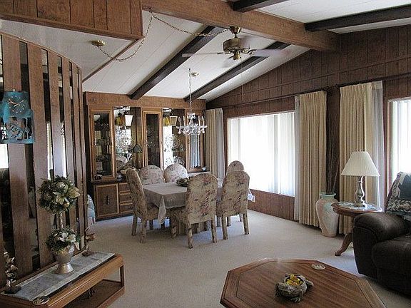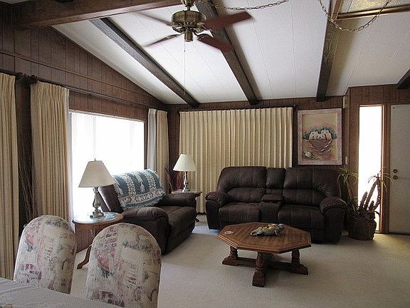 charming home in gated 55+ manufactured home community. 1979 Ramada. Land does not convey. Year: 1979 Size: 24 x 64 Beds: 2 Baths: 2 Land does not convey. Front door opens into large living room with decorative mirrored wall, off-white carpeting and beamed ceilings. The elegant dining area has a built in hutch. All window coverings stay which includes draperies, sheers and verticals. Double paned windows. . Kitchen has a large sink with lots of counter space, gas countertop stove with slide out shelves below for storage of pots and pans. Large pantry with built in shelves. All appliances included. Breakfast nook for an eat-in kitchen. Family area is next to sliding glass doors fabulous side yard with Privacy screening outside at porch area. Washer and dryer in the utility room has a built-in desk and lots of storage. There are two coat closets and one storage closet as well. This leads to jack and jill bathroom and second bedroom which is carpeted with large closet. Six ceiling fans throughout home. Master bedroom is large with mirrored closet doors with full bath.. Beautiful carpet. Master bath large and elegant with garden tub and walk in shower. 2 nd. Bedroom is large with large full-length closet. Also carpeted. Carport side has beautiful raised deck with storage shed. Great fenced in yard.