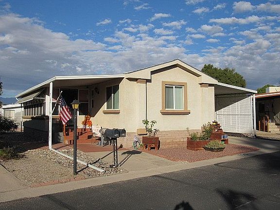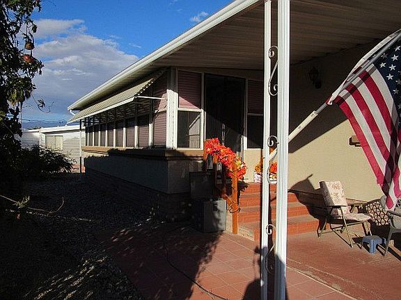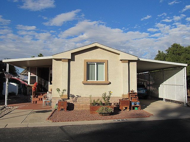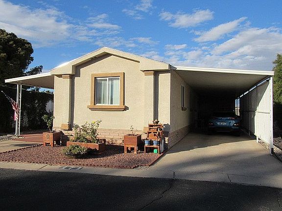 MHP Priced to sell at $69,000 Land does not convey. Gracious living in elegant home in gated 55+ manufactured home community. Come and discover our active 55+ Adult Community with mature plantings, manicured landscaping and all the amenities expected of a resort. Our superb location is nestled in a quiet residential area adjacent to a natural desert that is perfect for long walks in nature with beautiful Mountain Vistas. Our park is close to dining, employers, entertainment centers, markets and shopping. We offer the benefit a walled community, security cameras along with guards. Our pet friendly community features 2 refreshing swimming pools, an arts and crafts center, basketball court, billiards, club house that includes a gourmet kitchen, dry sauna, fitness center, hot tub, library, pickle ball to bocce ball, shuffle board along with professional on-site management. Residents may also enjoy community gardening, a patio area along with an array of resident activities. We also include a wide range of health, fitness and social programs. Home comes with l-year home warranty. Beautifully finished walls, vaulted ceiling. Finished Arizona room with air conditioning. New Gas Pac (heating and air conditioning) 2021. 5-year maintenance contract on fridge. Microwave included with other appliances. Third bedroom could also be used as craft room. Lock box outside for deliveries or storage for golf cart charger. Shed with electricity for storage, hobbies or gardening.