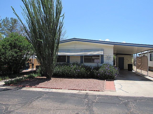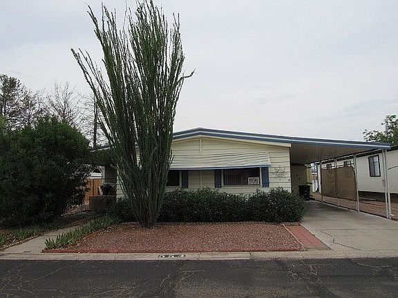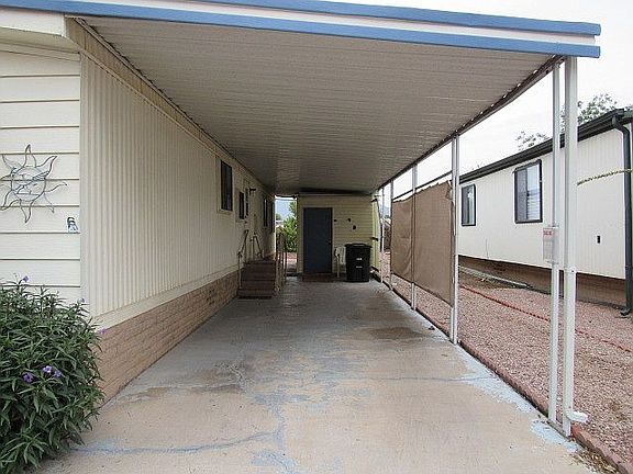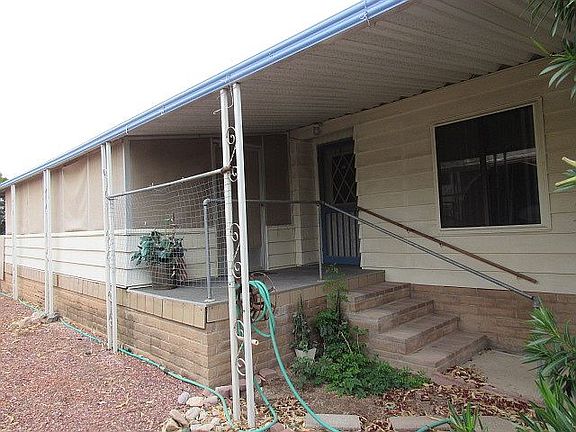 Gracious living in charming home in gated 55+ manufactured home community. The grounds contain two swimming pools, a community garden, library, workout room with brand new equipment, spa, sauna, private dog park and more. Our superb location is nestled in a quiet residential area adjacent to a natural desert that is perfect for long walks in nature with beautiful mountain vistas. The park is close to dining, employers, entertainment centers, markets and shopping. We offer the benefit a walled community, security cameras along with guards. Our pet friendly community features 2 refreshing swimming pools, an arts and crafts center, basketball court, billiards, club house w/gourmet kitchen, dry sauna, fitness center, hot tub, library, pickle ball to bocce ball, shuffle board along with professional on-site management. Residents may also enjoy community gardening, a patio area along with an array of resident activities. We also include a wide range of health, fitness and social programs including aerobics, bingo, cook outs, dancing, golf cart parades, luaus, movie night, ping pong, water volleyball, yoga and much more. Well maintained home on a quiet street with no neighbors in back. Lovely yard with wall and flowering plants. Large screened in porch with electricity. Vertical blinds in living room with lots of windows for lots of natural light. 2 storage sheds with electricity. Drywall throughout, cathedral ceilings, ceiling fans. Master bedroom has tiled bath en suite with walk in shower and built in dresser. Newly cleaned carpets and laminate floors. Tile floor in kitchen. All appliances included, lots of storage space. Built in china cabinet in dining area. Tiled laundry room has built in desk and lots of storage, washer and dryer included. Land does not convey.
