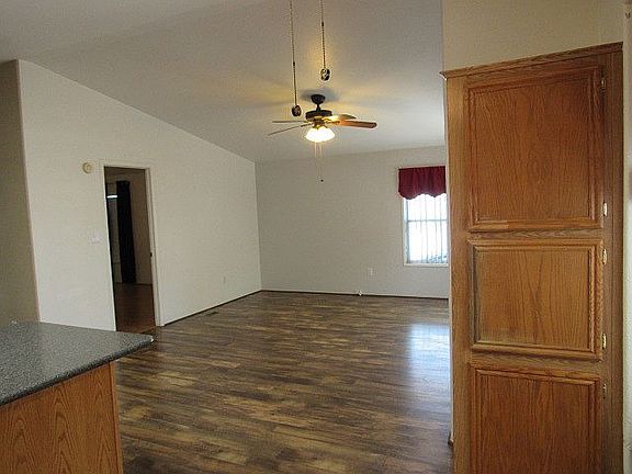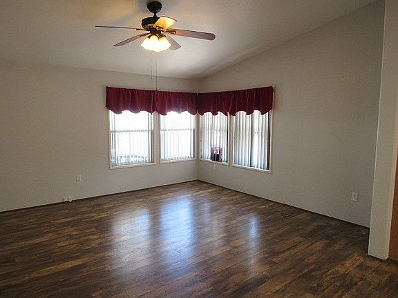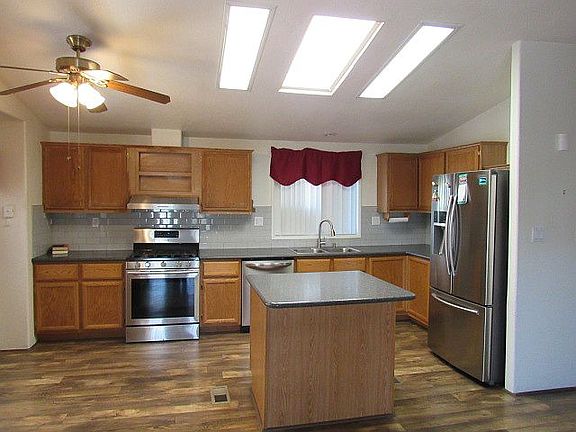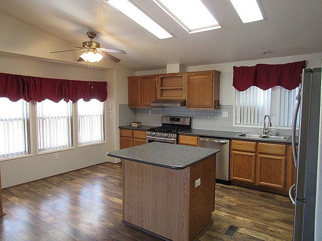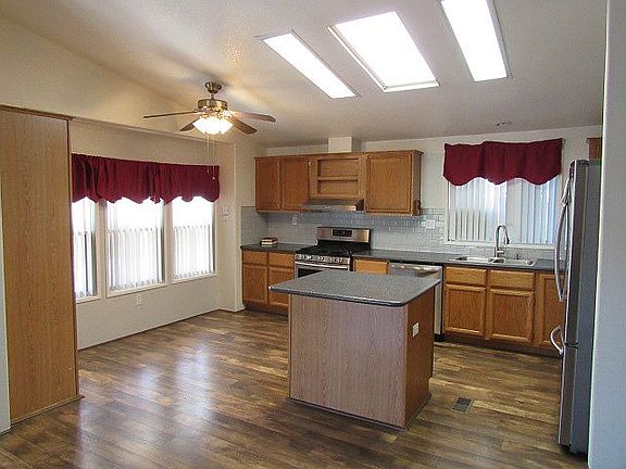 Buyer must be 55. Kitchen: All newer stainless-steel appliances. Samsung 5 burner gas stove. Samsung 3-door refrigerator. Garbage disposal. Skylight in the kitchen above the center island. Plenty of cabinets and large pantry in the kitchen. Granite countertops. Subway backsplash. Open kitchen to the family room. Formal dining room off kitchen. 8 large windows in the kitchen and family room for lots of natural light. Entrance from front deck into the foyer with closet and extra refrigerator. Vertical blinds on the windows. Newer vinyl plank flooring in the kitchen, family room, formal dining room, and foyer to match. The living room, and master bedroom including the hallway, have matching flooring along with 1 bedroom. Both bathrooms have vinyl flooring. Private office area has low-pile carpeting. The 3rd bedroom has carpet. The laundry room has vinyl flooring. Livingroom: Large living room with built-in entertainment are for your TV with bookcases on both sides. Shelves on top and cabinets doors on the bottom. Drop down shades on the windows. Office: Has an exterior entrance which leads to a back deck. Also, a door from the living room can be closed for privacy. Vertical blinds on the window. The office is also cooled by central air. Master Bedroom: Has two walk-in closets with lighting and mirrored doors. The master en-suite bath has double bowl vanity. A walk-in shower. Linen closet with doors. The commode is in a separate area with door to close. Shelving on the wall also. There is a closet off the master bath for more storage with a frosted window for more light. Exhaust fan in the bathroom. Laundry Room: Exit door to the carport. Two cabinets above with shelf where the washer and dryer go. Also in the laundry room is a coat closet with a shelf. Bedrooms: Both bedrooms have walk-in closets. One bedroom has a drop down shade the other has a mini blind. Guest Bathroom: Nice size bathroom with tub for relaxing. Off the guest bathroom in the hallway is a large storage area with 6 doors and shelving for blankets etc.. All doors throughout the home are 6 panel doors. Three skylights, one large one in the kitchen and smaller skylights in both bathrooms. The skylights in both bathrooms have stained glass. Three exterior doors include security doors. The home comes with 2 storage rooms. Plenty of parking. Water filtration for good tasting, clean water throughout. Double-pane windows for better cooling and heating. Awnings cover most of the windows on the exterior. Walls are all drywalled. Home has been re-piped. Water heater has been replaced in 2021. The A/C is approximately 3 years old. The roof has been re-coated. Home has dual cooling. Land does not convey. Lot rent $640.50 +