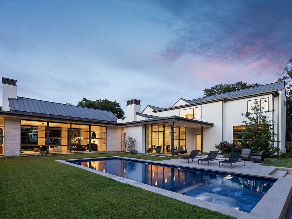 Seated on a lush 1.035-acre lot filled with mature oak trees, this dynamic contemporary construction served as the personal residence and dream home for its builder, Reynolds Custom Homes. Designed in collaboration with Larue Architects, this Hill Country home maximizes outdoor living spaces with a sleek pool and disappearing spa, framed by a spacious shaded living area with a fireplace and a summer kitchen in the backyard. Sweeping floor-to-ceiling windows illuminate the interior, with light bouncing of light oak floors. A traditional living and dining space opens to a pristine limestone-covered patio with a full bar for serving and entertaining guests. Featuring a sparkling marble and walnut island and designer light fixtures, the gourmet chef's kitchen connects to a casual family room. Occupying a private wing on the first floor and opening directly to the patio, the luxurious primary suite includes His and Hers walk-in closets and a spa bath. Fulfill your every need on the main floor, which also boasts a game room, full guest suite, library/office, large utility room, and craft room. Upstairs, three additional en-suite guest bedrooms open up to a sunny sitting area that overlooks the backyard. Secluded and private, this home lies across the way from the Barton Creek Reserve, filled with rolling hills and nature trails. Only one mile from Mopac and 360, the location is incredibly convenient without sacrificing privacy. With its careful craftsmanship and sophisticated finishes, this property embodies contemporary luxury, tucked away in quiet and beautiful Hill Country.