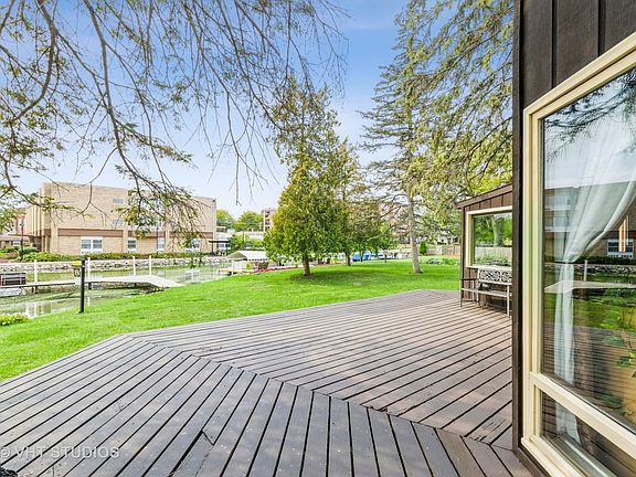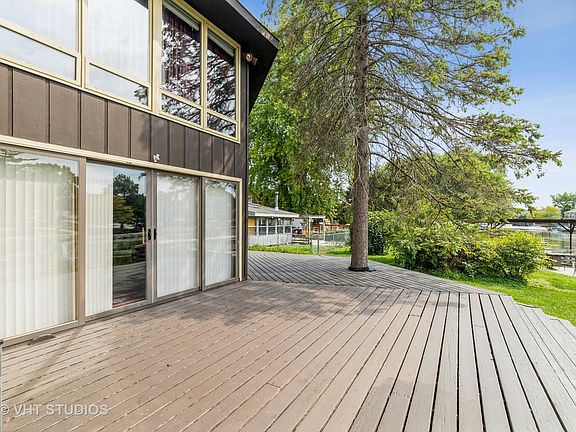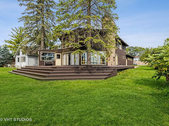 Custom built home with 50 foot frontage on a deep Fox River channel with huge L-Shaped pier included. Spanning almost 3000 square feet, this wide open floor plan boasts a 32x26 great room with massive stone fireplace, spruce hardwood floors, and double sliders to the redwood wrap-around deck overlooking the waterfront and popular downtown Riverwalk district. The 4-bedrooms on the second level include a gigantic 32x19 primary suite complete with a private full bath and 2nd fireplace. There's a 1st-home office, a real woodburning sauna, former hot tub room, and a 38x32 heated garage with 11' ceilings and a rail hoist ideal automotive hobbies, collectors, or home based business. A perfect place to entertain, boat, fish, swim, and snowmobile until your hearts content so call and schedule a private showing today. Flood insurance is not required.