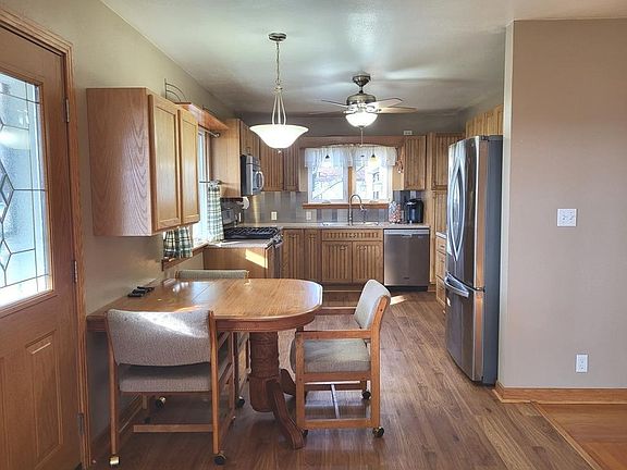 LOCATION & LAND to call your own. This maintained property has a lot to offer. 2 parcels total 1.4 Acres. The home has hard wood oak floors and updated vinyl flooring. Open livingroom with dining room and kitchen. Kitchen has updated hardwood cabinetry, stainless steel appliances, and newer sink, also 4 new windows, 2 decent sized bedrooms, and updated bathroom with walk in shower and built in seat. Solid wood stairs walk up to completely floored bonus room waiting to be finished into large primary bedroom and bath or 2 more bedrooms. Attached 3 season room has plenty of windows, additional freezer remains. Full basement with large Rec room and additional cabinets offering plenty of storage for games/ hobbies. Washer and Dryer will also remain. Attached deep 17X26 Garage with sliding doors leading out to patio. There is also a detached 20X22 garage, and a 14X32 Tuff Shed with overhead door and electric. Black topped U shaped driveway and more! Home is being sold AS IS in an estate.