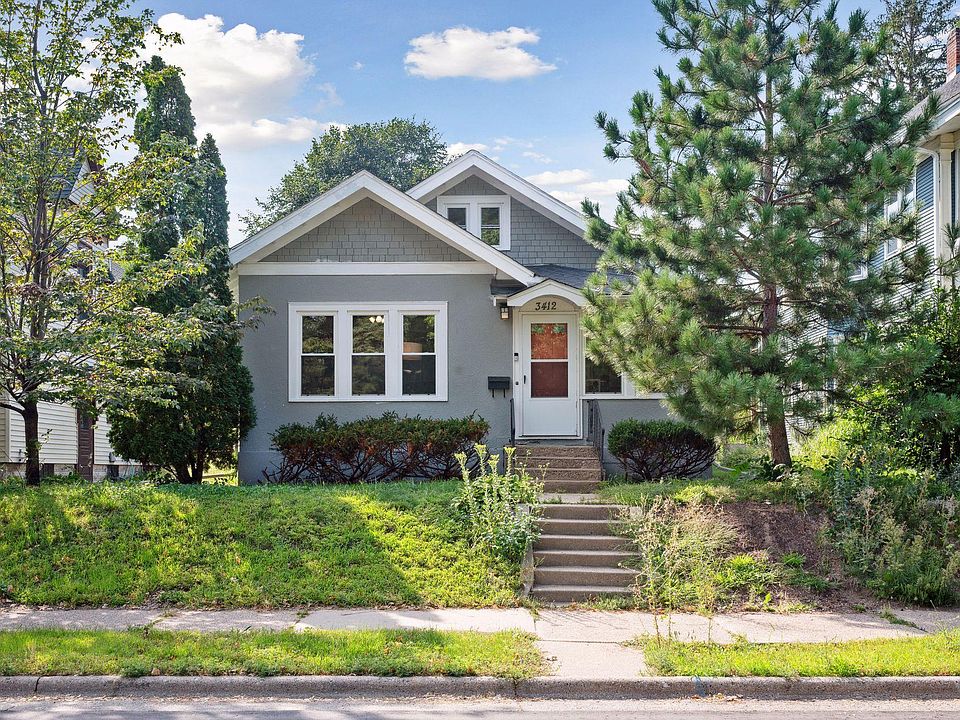 Charming Corcoran Bungalow! Maple hardwood floors and original oak trim throughout the main level. Four season front porch would also make a great home office with heat & AC year-round. Bright living room with crown moulding and piano windows. Classic dining room with incredible oak buffet on the side, allowing for future opening up of the kitchen. Adorable kitchen with newer gas range, stainless fridge, and a wall of original cabinets. Two main floor bedrooms. Full main floor bathroom with pedestal sink, and tile floor/surround. Large upper-level bedroom with seven foot ceiling. Full unfinished basement with glass block windows. Spacious back deck overlooks the shaded back yard and is great for outdoor entertaining. Freshly painted one car garage and additional off-street parking. New vinyl windows (2023) & roof (2020). Furnace, AC, and water heater all replaced in 2014. Gigabit fiber internet installed! Great location right by Corcoran Park and close to many neighborhood amenities.