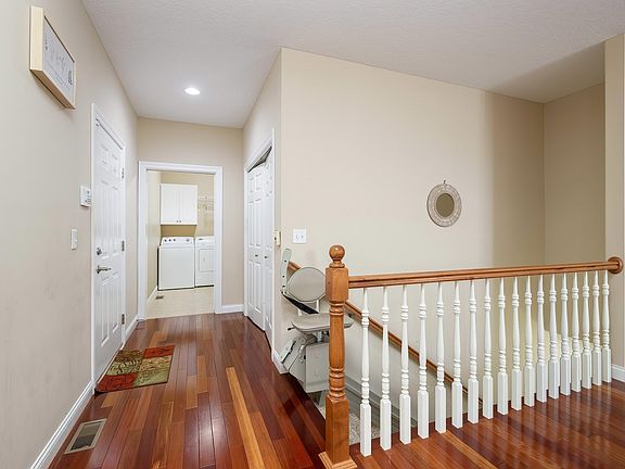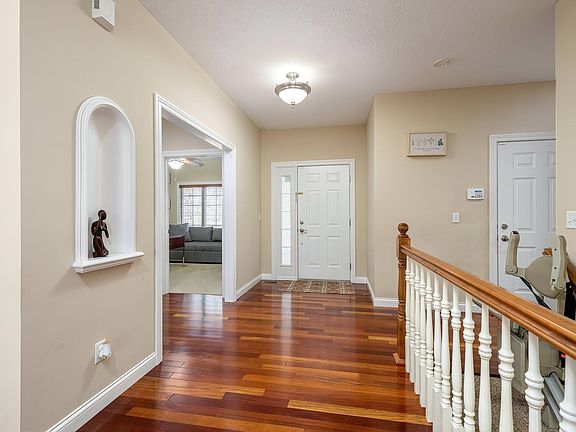 Beautiful ranch style town home with wonderful views of the beautifully landscaped pond, fountain and gorgeous wooded backdrop on a cul-de-sac! Open floor plan with cherry wood floors from the foyer through the dining, great room and kitchen. Spacious great room with cathedral ceiling and gas fireplace open to the kitchen and 3 seasons porch. Kitchen with center island and stainless steel appliances. Primary bedroom with tray ceiling, access to the deck, double sinks, walk-in shower and closet with convenient access to the laundry area. Finished walk-out lower level with large rec room with wet bar and a mini frig, game room and more! Whole house generator. New roof 2020. No step entry.