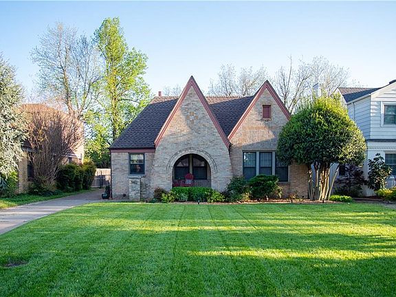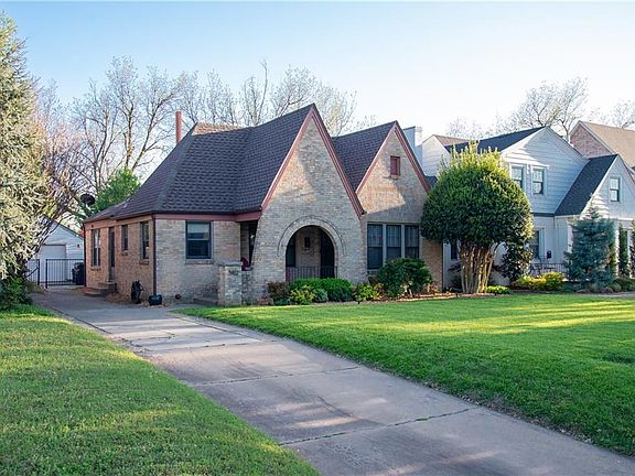 Linwood home - Move in Ready! This Tudor-style home has so much charm and unique features making it a Must See! Featuring originally architecturally designed front door, 2 spacious bedrooms, separate area off master to use for office, 2 full baths, large dining area, living room with vaulted ceiling, tile fireplace and for your convenience an inside utility behind a custom barn door. Enjoy the evenings on your covered front porch or back yard they both have beautiful landscaping. Washer/Dryer, refrigerator, hutch and built in desk area stay with home. Detached oversized 1 car garage. Easy access to all areas of Oklahoma City.