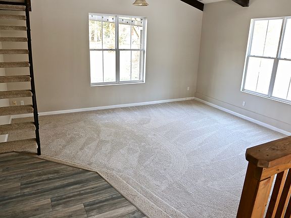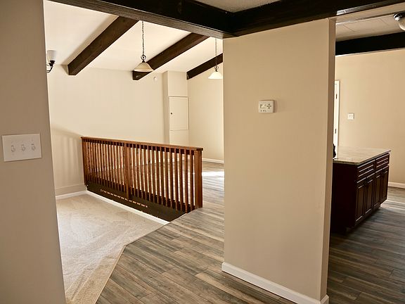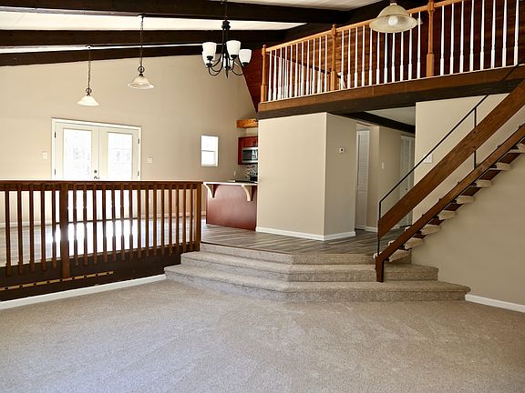 FOR SALE, FOR RENT or LEASE PURCHASE! This lake community home offers the perfect mix of contemporary style and ski chalet charm. Walk in the double front doors to a beautiful entryway and an open floor plan that floods with natural light. Cathedral ceilings with exposed wooden beams over the entire living area. The sunken living room also boasts wall-to-wall carpet and a loft that overlooks the first floor. Engineered floors, soft close cabinetry, granite counter tops, new appliances, breakfast bar, large pantry, and endless tile backsplash make the kitchen a must have! The dining room flows through French doors out onto to the 20x10 deck. Mature trees surround the backyard making it a great outdoor retreat. Back inside, all bedrooms feature wall-to-wall carpet and deep closets. The master bedroom features an en suite bathroom with tile backsplash in the shower. The second full bathroom features beautiful tile floors.