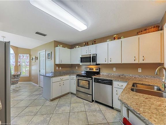 Perfectly situated on a quiet cul-de-sac located on the 18th hole in Highlands Ridge south course. This 3 bedroom/ 2 bath home is move in ready with many attractive features. Open concept split floor plan, vaulted ceilings, diagonal tile throughout the entire home, granite counter tops in the spacious kitchen, new ss appliances, white cabinets, bay window in the dining area and large pantry. The master suite has a large walk-in closet, plant shelves, dual sinks, garden tub, shower and sliders to the screened lanai. The guest suite has a private bath, french doors to the 3rd bedroom that could be an office/ den. The living room has an awesome view of the secluded backyard with sliders to the lanai. Beautiful landscaping, decorative curbing, lemon, loquat, mango and orange trees. Newer roof 2017, AC 2014. You will love this home and this active community.