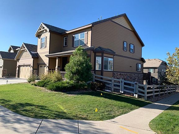Popular Anthem Dillon floor plan on a corner lot. It is walking distance from Thunder Vista P-8 school in desirable Adams 12 school district. The main floor offers a spacious two-story great room, formal dining room with a butler's pantry, gourmet kitchen with a granite center island featuring GE Profile appliances which include a double oven, microwave, dishwasher & refrigerator. It also has a main level study and a laundry room. Upstairs, discover four generous bedrooms & 3 baths. Includes a finished garden level basement which has a huge family room, a media room, a bedroom & a bath. Backyard features a deck on the main level & a huge pavers patio at the base of the stairs. Tenant is responsible for all utilities. 1 Small mature dog possible with approval. No cats or large dogs allowed and pet deposit paid. HOA dues is included in the rent which gives access to Parkside Community Center - an exclusive community center for Anthem residents.