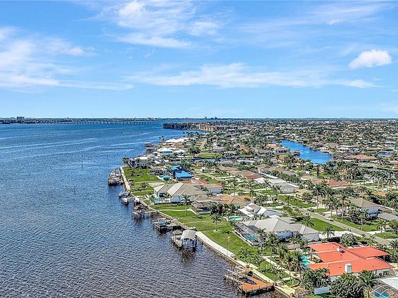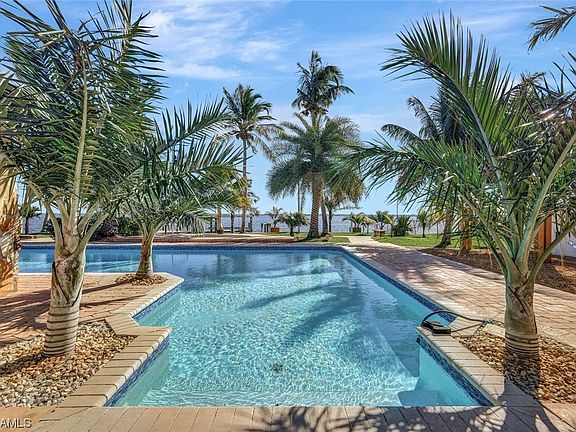 Riverfront Estate Home - One-of-a-kind property with .57 acres (4 lot) on the River! This remarkable home features a recent modern remodeled interior with 5 Bedrooms 3 Full Bathrooms and over 3,754 SF living area inside plus spectacular outdoor pool area overlooking the Caloosahatchee River - Cape Coral's Intracoastal Waterway. Entertainer's kitchen with island and newer appliances, cabinetry, and stunning counter tops. Separate living and family rooms each with soaring cathedral ceilings and endless water views! Formal dining features a custom saltwater aquarium! Virtually like new this home comes loaded with updated flooring, paint, lighting, fans, and closet systems throughout. Space for everyone with 4 spacious bedrooms and full bathrooms for family & guests. Like having a personal resort in your back yard! Expansive paver deck and walk-way centered by a large pool. Relax on the hammock listening to the waves crash or enjoy a cocktail in the intimate hidden seating area with stack stone rock wall and Jasmine trellis. Lots of sunny deck space to lay out & entertain on the patio with wood ceilings and dining space. YOU CAN ONLY GET THIS HERE - The oversized 4-lot site gives allows for a huge pool PLUS plenty of yard, dog run, playground, Koi Pond, and TONS OF PRIVACY without feeling like you have any neighbors. Over 50 exotic palm trees (many rare palms) adorning the property and Large Koi Pond idea for the nature lover. BOATERS - Newer Dock & 20,000 Pound Boat Lift with FAST open water access right from the backyard. 2 car garage plus up to 4 cars under the porte-cochere. Panoramic Water Views for miles, loaded with features & high-end remodel, outdoor living space only an oversize lot can provide, metal roof, and being Sold furnished.