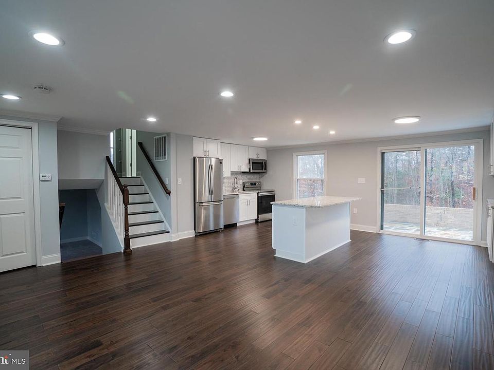 - Kitchen Island, Recessed Lighting, Eat-in Kitchen, Carpet, Floor Plan - Traditional, Combination Kitchen/Living