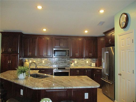 You will be delighted from the moment you enter through the double stained glass doors. This Open floor plan 4/2/2 has triple split bedroom configuration. Wide, tiled foyer has lighted recessed shelves for your most treasured collectibles, high arches lead you through to the Formal Dining opposite your cozy Formal Living Room that has openings for a full view of the Family Room and the oversized screened patio (14' x 40') and the picturesque pond behind your home. The Family Room is open to the Amish, Custom designed kitchen with Beautiful granite, cherry wood soft-close cabinetry and all of the fabulous upgrades you can imagine. All shelving pulls out for your convenience,lg. drawers can hold full sets of dishes and special appliance shelf pulls out and rises to counter height so you don't need to lift or rearrange your counters to accommodate it. The island provides even more storage and a breakfast bar. Separate breakfast nook, too. Master Suite access is from Fam. rm. and includes lg. walk-in closet and spa inspired bath layout.