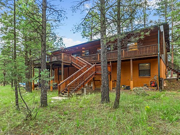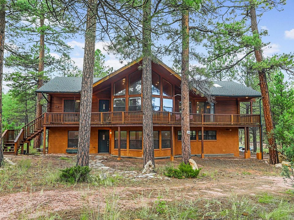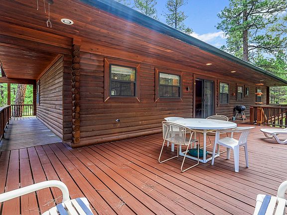 BORDERS NATIONAL FOREST!! FULL LOG CABIN BEAUTY!! Relax on the peaceful deck & watch deer & elk from your expansive back yard of endless national forest! This cabin w/3 bedrm, 2/12 bath sits on the back side of the subdivision, affording you quiet solitude: surrounded by gorgeous tall pines & all that nature has to offer. The spacious kitchen is absolutely stunning w/ L-shaped Corian countertops, stainless steel appl, incl gas range, dishwasher, & pantry. Large dining area w/ adjacent family rm. Sep great rm w/ gorgeous wood vaulted ceilings & large sunny windows. Master on the main w/ walk in closet & separate soaking tub. Finished basemt incl 2 large guest bedrms & great utility rm. 2 car garage. Front & back decks for great family entertmnt. Cabin comes fully furnushed. A must see!