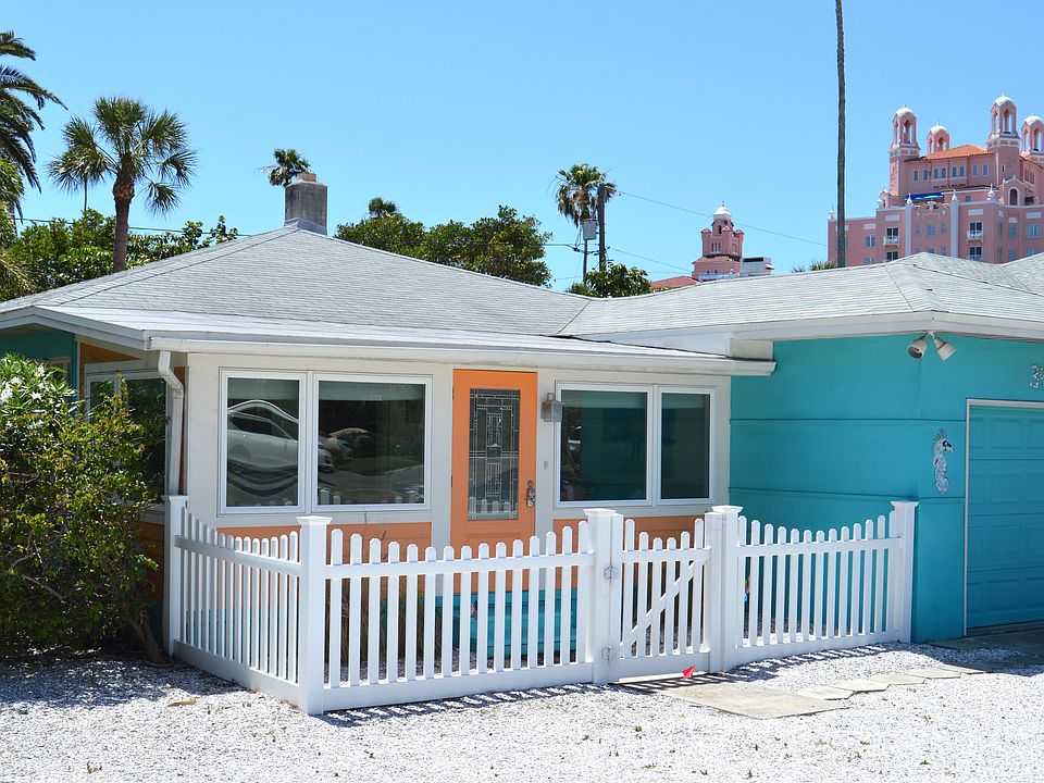This Cute Beach Bungalow can now be yours! Located on Trip Advisor's Top-Rated St Pete Beach, you're just steps away from white sands & the Iconic Don CeSar Hotel. This is the perfect Vacation home & its being sold COMPLETELY FURNISHED with Coastal Décor from Ballard Designs & Treehouse Gallery, just bring your bags! Step inside to find 1,069 SqFt of beach house charm with a bright & airy layout featuring 2 bedrooms, 1 ½ baths & an enclosed sunroom with water views. The kitchen is remodeled with new cabinetry, appliances, marble tile counter tops, Granite bar & tongue & groove ceiling. Beautifully updated bath with Travertine tile, new vanity & fixtures. The outdoor living space is private & secluded with tropical landscaping & plenty of room for a pool! Rinse off after a day at the beach in the extra shower in the garage. More updates include a newer electric panel, plumbing, crown molding & flooring. If you're a boater you're in luck, the boat ramp is just around the corner with easy access to the Gulf of Mexico & waterfront restaurants. Bike down to Historic 8th Ave in Pass-A-Grille for shopping, dining & tons of events! Take a stroll to Lazarillo Park & the Iconic Don CeSar Hotel where you can become a member to enjoy all the benefits including pools, Spa Oceana & more! While you're here, get out & explore off the beach! Take a short drive to the Vibrant Downtown St. Pete for exciting events, 5-star dining, museums, & more! Bring your bags & start making memories at your new Beach Bungalow today!