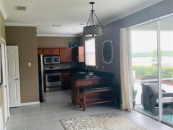 Meticulously maintained Water Front home, open, airy two story with 4 bedrooms and 2.5 baths. Loaded with New upgrades : NEW ROOF, 2 NEW AC'S, NEW DISHWASHER, NEW WASHER & DRYER. The kitchen has plenty of cabinet space, Granite counter tops, stainless steel appliance, breakfast bar, tile floors, Family room comes with a 55" mounted TV. Granite counter tops in bathrooms, his and her sinks and walk in closet. Indoor utility room, Waterfront view from the spacious covered and screened back lanai with electric for TV mount and large custom open patio. Check out the fishing, I hear the bass are biting! Landscaping surrounds this lovely home, Japanese blueberry tree in the over-sized back yard backing to private lake. More extras like washer, dryer, TV, ceiling fans, new window treatments, rear gutters, new garage door opener, LED outlets, crown molding. A must see! 24/7 staffed gatehouse community. Cable, Internet ,mowing included in the HOA, Amenities include clubhouse, Junior Olympic size heated pool and spa, tennis courts walking trails, boat ramp, billiards, fishing pier, playground and basketball. Easy access to belt way, mall, I-4, Lakeland airport. 72 feet of private back yard water frontage with common area in between for boat, kayak and water access, roof warranty transferable.