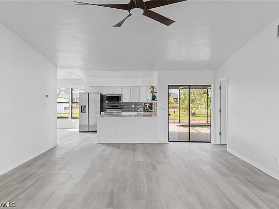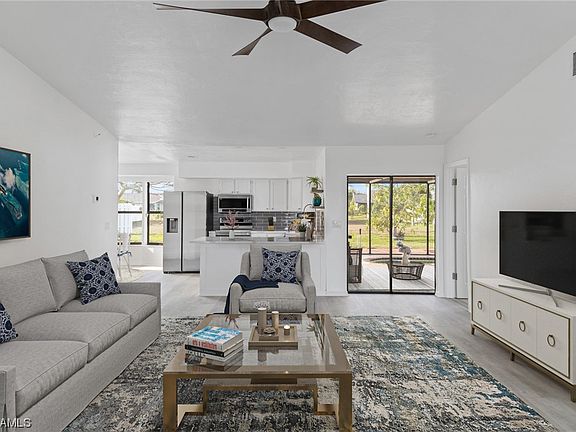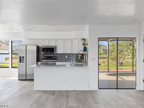 You will love this bright and beautifully remodeled 3 bedroom 2 bath home ideally located in one of the most established neighborhoods in SE Cape Coral. New roof complete March 2023. The spacious living room has vaulted ceilings and is open to the renovated kitchen containing quartz countertops, tile backsplash and new stainless appliances. The primary bedroom includes a remodeled bathroom and a large walk in closet with sliding glass doors out to the Lanai. Updates include AC and electrical panel 2022, re-pipe 2007, Nucore Luxury Vinyl Flooring, bathrooms renovated, exterior and interior paint, whole house fans and lighting. The 18 x 22 spacious lanai is a fantastic outdoor living space which includes a heated spa/plunge pool, new screening with picture window panels, framing the spacious backyard (.25 acres). Home is on city water and sewers with paid assessments. Call today for your appointment.