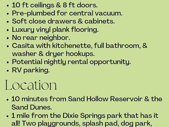 Are you looking for a beautiful new home in Dixie Springs? Here it is! This home is nearly complete and designed with 4 bedrooms (a Casita), 3 bathrooms, custom cabinets, beautiful counter tops, walk in closets, pantry and a covered patio. Close to Sand Hollow Reservoir, Dixie Springs Park. The listing brokers offer of compensation is made only to participants of the MLS where the listing is filed.