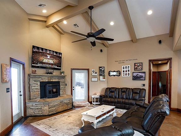 DRIVE DOWN THE WINDING DRIVEWAY AND SEE COUNTRY LIVING AT ITS BEST! DON’T MISS OUT ON THIS BEAUTIFUL 5 BEDROOM, 3 BATH HOME ON 47 ACRES. Covered front porch leads into the large open living area, 12 foot beamed ceilings, rock pellet fireplace and windows with a wonderful view. The doors from the living room will lead you to a covered patio and outside kitchen with pellet smoker, makes it the perfect place for entertaining. The spacious kitchen offers granite counter tops, center island with eating bar, abundant cabinets and counter tops, stainless steel appliances, large walk in pantry and stained concrete floors. The dining room has a built in buffet and hutch with room for family gatherings. Master bedroom have two walk in closets with built in dressers. Room for your king size bed and has a built in vanity. Master bath has an oversized shower, soaker tub and double vanity. The four bedrooms are arranged with a split bedroom downstairs. Upstairs enjoy the fifth bedroom and large bonus/game room making this a great family home. The utility room is spacious and has a folding table and ironing board. Two car garage is great for Oklahoma weather. Custom blinds throughout, 3 zone heat & air and Falco alarm system are some of the many updates. Large walk in attic with spray foam insulation. 40x60 shop with a 6 inch slab, water, 6 50 amp 220 hook ups, jib hoist and LED lighting. North and south 10x10 roll up doors and south walk through door. 5 strand 4 point barb wire perimeter fence and small set of working pens with water and electric. Don’t forget the two ponds and plenty of native grass for your livestock. Lots of wildlife, deer, turkey and more. Pawnee RWD #3 rural water. Home is all electric but the propane for the range cook top. Just 15 minutes from Stillwater/OSU, minutes from the turnpike and one hour to OKC and Tulsa. Great location! Call for more information.