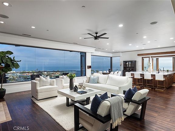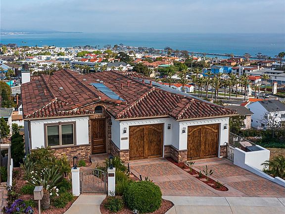 A Crown Jewel of Dana Point. Experience unobstructed ocean and city-light views at this custom estate, set on one of the highest elevations and most desired cul-de-sac streets of Dana Point. This premier street-to-street lot is a short stroll to dining and shops, minutes to the harbor and beaches. Curb appeal abounds, and floor-to-ceiling windows on each level capture panoramic ocean views from coastline to San Clemente. Newly remodeled in modern Spanish style and repainted inside and out, the home showcases fine craftsmanship including custom alcoves and 8’ mahogany doors. Upgrades include paid solar, designer light fixtures, automatic shades and lights, and alarm. Office and bonus room offer space to work and play, and a home theatre is the ultimate entertainment experience. An elevator whisks you between levels, adding to the convenience of the thoughtful layout. The open great room combines dedicated office space with large living and dining areas and ocean views. New chef’s kitchen boasts quartz counters, large island and top-quality appliances. Hardwood floors grace the main level, with designer carpets in bedrooms and full downstairs. Spectacular sweeping stairs with wrought-iron balusters beckon to 3 en-suite bedrooms downstairs and one on the main level. Wake to ocean views in the primary suite with fireplace, private balcony, custom vanity area and spa-inspired bath. Ideal view balconies and a large lower patio with firepit add to the luxury lifestyle. A true gem!