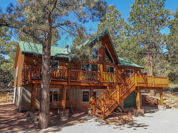 Quality built chalet situated amongst majestic pines on 8.43 acres backing Dixie National Forest is what you have been looking for! 2660 square feet encompasses four bedrooms and three full baths, with vaulted ceilings and an open concept main living area. Cozy up with the gas fireplace in the great room that looks out into the pine forest through the beautiful chalet front windows. Master bedroom on the main level with en suite full bath. Custom lighting, maple cabinets, and maple floors. Stainless appliances and under cabinet lighting. Tastefully adorned with cedarwood in the great room. Ceiling fans in all rooms. Laundry facilities on the lower level with plenty of storage. Forced central heat & air. All windows and doors treated with non-breakage film. The oversized attached one-car garage can house your toys. Enjoy outdoor living with 2 custom firepits set up for bbq, log benches & log swing, fenced dog run, and spacious decking for true mountain fun. RV dump located alongside of cabin-perfect for guests who bring their camper to visit! This beautiful home has seen very little use and has only had one family to love it. Come see this property today
