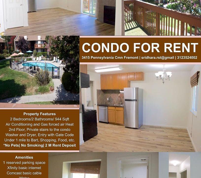Highlights Washer and Dryer Vaulted Ceiling Fireplace Wood flooring (Vinyl Laminate) Window bench seating with storage in both bedrooms Patio with artificial turf and a pool view Community Swimming pool Private stairs to the condo Security door to enter the complex (Not the parking space) Less than 1 mile to Bart, Whole foods, Fremont Hub and upcoming Fremont downtown What is included 1 reserved parking space Xfinity basic internet Comcast basic cable Water Garbage Monthly house cleaning Renters insurance Single uncovered parking spot (Garage not included) Utilities Not Included in the Rent: Gas and Electricity Eligibility Requirements Provide proof of Income Last 3 months Paystubs and most recent W2 Rent to Income Ratio - 1:3 Maximum of 4 people No Smoking in the unit No Smoking in the community as per HOA rules No Pets Rental Amount Requirements First and Last Month Rent upon lease signing Security Deposit One month rent upon lease signing Tenants responsible for House Maintenance & Repairs under $100 Tenants responsible for all penalties due to negligence of HOA rules or damage to the property Monthly Rent due on the 1st of the Month.