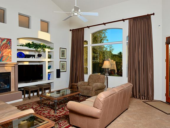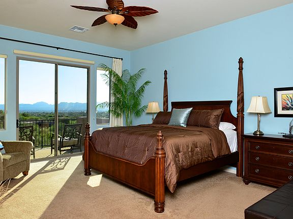 Warm and inviting 3BD/2.5BA plus den and loft. As you enter this home you will be charmed by the neutral colors, soaring ceilings and views. Den off the foyer serves as an office or private area. The eat-in kitchen has ample granite counters and cabinets with crown molding. Opening to the great room with a breakfast bar, this home is an entertainer's delight. A cozy family dining area overlooks the private rear patio. Enjoy the great room w/ fireplace and built-in entertainment center. Formal dining area adjoins the great room. An open loft overlooks the great room. Master suite w/balcony has fantastic views over natural desert and golf course to downtown and Tucson Mountains. Private rear covered patio w/ flagstone backyard includes built-in BBQ, fireplace with seating and city lights.