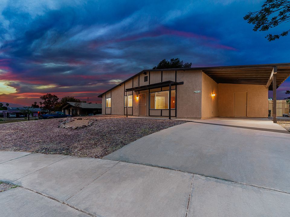 Modern 3 bedroom/2 bathroom, 2 living area home with indoor laundry room, dual cooling systems with Evaporation and BRAND NEW A/C unit. Ceramic tile through out with carpet in bedrooms. Custom two tone paint, dual pane windows, ceiling fans throughout, new cabinetry in kitchen with granite counter tops. Family room off kitchen has French door access to back yard and gorgeous wood burning stone fireplace focal point. Huge backyard with infinite possibilities with double gate access and covered patio. Your next chapter starts here.