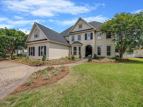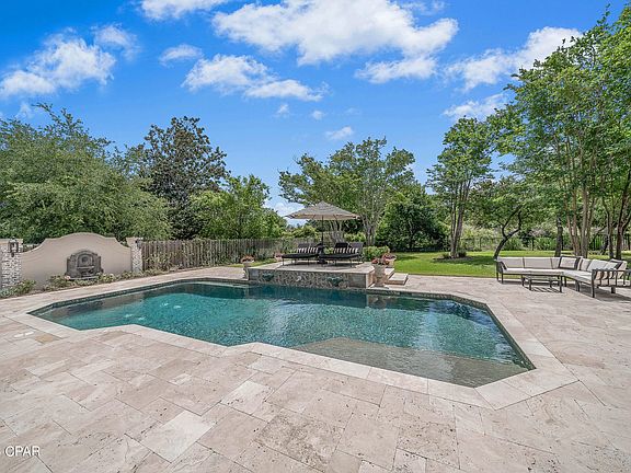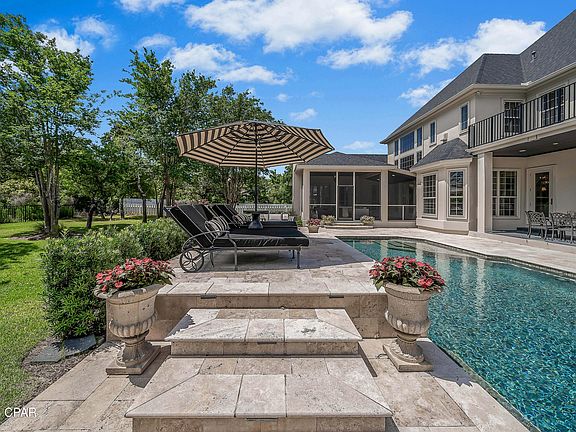 CURRENTLY UNDER CONTRACT, SELLER WILL CONSIDER BACKUP OFFERS Simply stunning! This home has been completely remodeled, down to the studs, including walls moved and adding square footage, all custom with exquisite details. Gorgeous new white oak hardwood floors in a beautiful herringbone pattern, new kitchen, all new bedrooms and baths, new screened in outdoor living space, newly redone pool and outdoor patio, new fixtures, almost everything is brand new, inside and out! This is the home you have been waiting for with 5 bedrooms, 4 and a half baths, 2 kitchens, incredible screened in outdoor living room with fireplace, beautiful pool with spacious travertine patio, oversized lot with lovely large backyard, circular drive, and 3 car garage. This home features 5 fireplaces, including 3 downstairs, 1 upstairs and a wood burning fireplace on your screened in outdoor living space. The custom kitchen is a chef's dream, and perfect for entertaining large gatherings, as well as intimate for catering to smaller family gatherings. Just a few features are La Cornue range and custom hood to match, custom cabinetry with built in china cabinet, coffee bar and walk in pantry. To add to your dream kitchen, you have a separate butler's kitchen complete with double ovens, dishwasher and warming drawer. The main kitchen is open to your living room with Belgian blue stone fireplace, wet bar with bistro shelves, built in storage cabinets, and custom tv cabinet with mirror doors. The library features custom shelving and an American Victorian cast iron fireplace, and carved oak chandelier. The sellers spared no expense adding a first-floor master bedroom with impressive master bath complete with stained glass window, and French colonial double doors leading into the custom closet. Upstairs are 3 bedrooms, each with private bath, and bonus room with additional art room. Bonus room may be used as the 5th bedroom; and could easily be turned into an upstairs master bedroom as it already has a complete master bath and fireplace, as well as spacious balcony. The exterior of the home is lovely and has plenty of room for cars with a front circular drive, large side driveway and 3 car garage. Step into the backyard where you have a spectacular patio perfect for lounging or entertaining, an inviting oversized pool, covered porch area for dining, expansive yard with trees, and a beautiful screened in outdoor living room with fireplace. Enjoy the Bay Point lifestyle in this gated, waterfront community with brand new state of the art marina, golf, tennis, and close to shopping, dining and the beautiful white sandy beaches of Panama City Beach. Call today for your private showing of this luxurious home. For more details on custom renovations, please see information sheet.