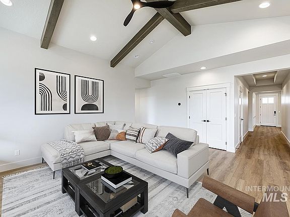 The FOXFIRE MODEL| Blackrock Homes. Move-In Ready! All new plan featuring 30' deep RV/Boat Bay with 9' x 11' door. Apart of the Pinnacle Collection at Skybreak- Enjoy COMMUNITY POOL (2025), pickle ball court, playground + community dog parks! South backyard, Backs up to season creek with no direct backyard neighbors. Upgraded finishes include custom cabinets, all quartz countertops, hardwood (lvp), upgraded trim detail including stained ceiling beams in living room, SS appliances including built-in 5 burner industrial gas range, built in Bosch oven, microwave & dishwasher. Walk-in butler's pantry + tons of additional storage throughout. Light & airy floor plan w/lots of natural light & cozy fireplace. Tile floors in laundry, secondary & primary baths. East facing backyard w/covered patio. INCLUDES FULL VINYL & WROUGHT IRON FENCING. FRONT & REAR YARD SPRINKLERS & LANDSCAPING. Easy access to the interstate, Downtown Meridian, shopping, dining, & entertainment.