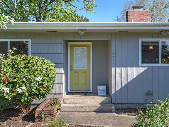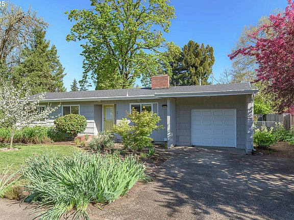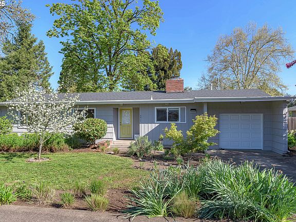 This house makes you feel good! Nearly fully remodeled 2 bedroom, 1 bath modern ranch has incredible light and lovely updates. Set back off the street with a front yard filled with flowers and an apple tree, step inside to find hardwood floors throughout with huge windows and great flow. The galley kitchen was updated in 2017 with marmoleum floors, quartz counters, stainless steel appliances and ample counter space. Open dining/family/living room flows well and features floor to ceiling windows, fireplace, ceiling fan, and a new ductless heat pump providing heat and AC. Both bedrooms are spacious and bright with lots of closet space. Bathroom is also updated with a new vanity, quartz counter, lighting and mirror. From french doors off the living room, access a huge and productive back yard - fully fenced, with raised beds and mature landscaping, mostly organically tended. The property is .23 acres total with both covered and uncovered back patio areas. Has a 1 car garage, gas furnace, updated water heater and electric panel. It is really in tip top shape! Convenient to shopping at Oakway and Gateway centers, bikeable to downtown and University of Oregon, on bus line, and near schools and parks. Incredible quality and updates for the price, with a dreamy yard. Come see at the open houses Saturday and Sunday 11-1 each day.