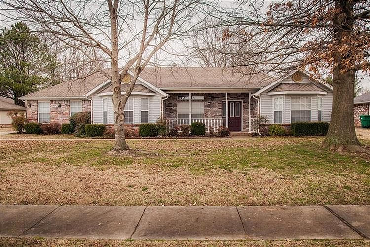 This is a fantastic brick home with side entry garage. Relax on the front porch or on partially covered back patio while overlooking the gorgeous shade treed lot. Inside the home features living room with built-in bookshelves and gas log fireplace, formal dining room, spacious kitchen with bay window breakfast nook and island bar eating space, walk-in pantry, utility with storage and flex room that would be a great office craft room storage etc. Master bedroom with bay window has en suite bath with double sink vanity, walk-in shower, jetted tub and large closet, and the two guest bedrooms share a hall bathroom with combo shower and tub. Three car garage has one stall that is walled off and would make great workshop. Detached metal building conveys and provides lots of additional storage. Home also has gutters, tray ceilings, transom windows, plus built-in desks in kitchen and master. Refrigerator, washer and dryer all convey. This wonderful home is convenient to Hwy 412, I-49, shopping, restaurants, medical facilities, parks and more.